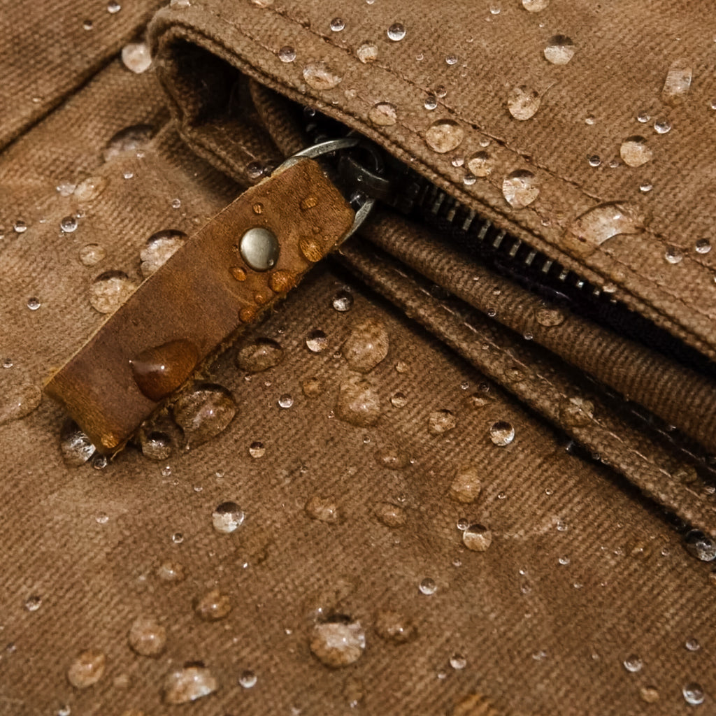 Constructed from weather and water-resistant waxed canvas, it’s designed to endure rugged conditions while maintaining a sleek look.