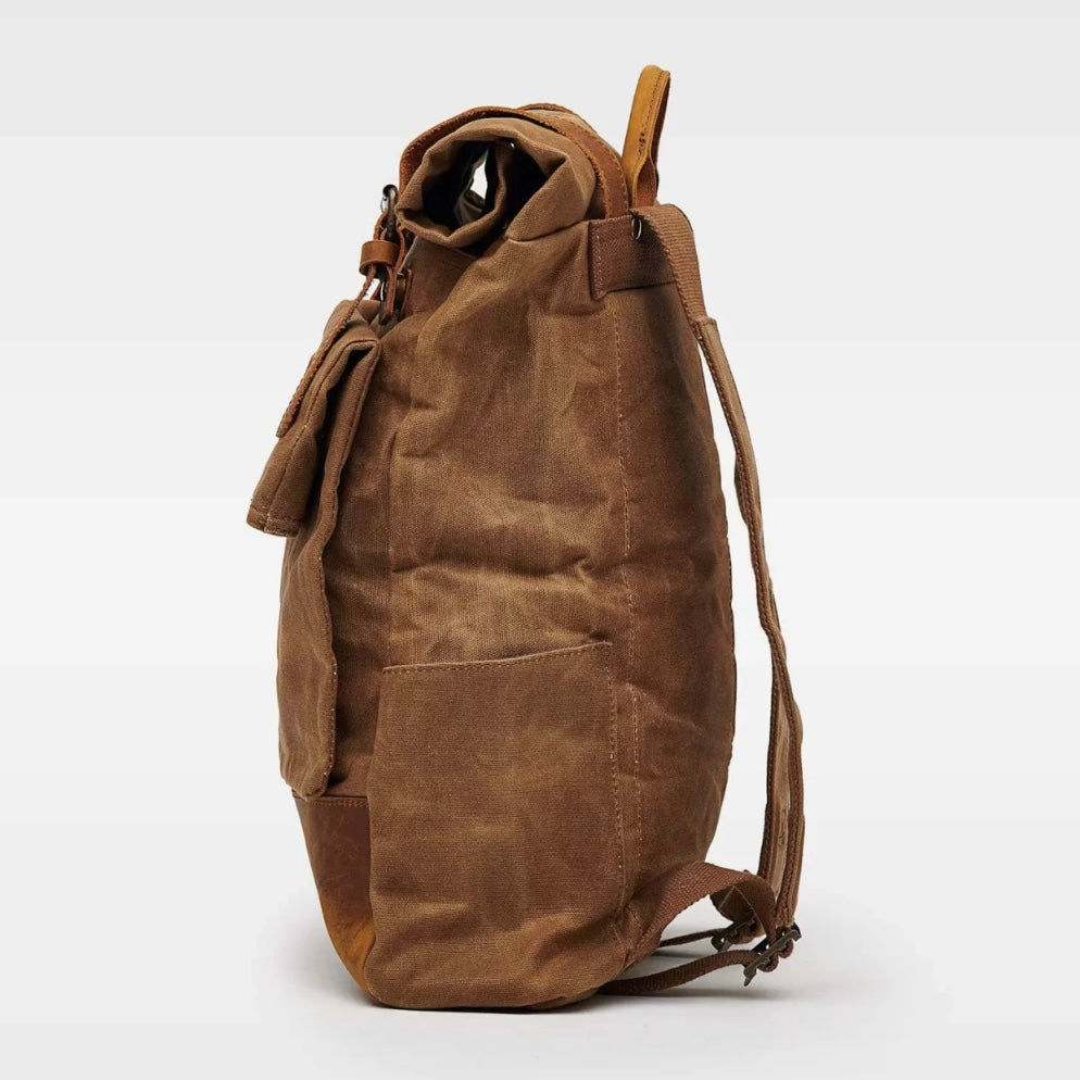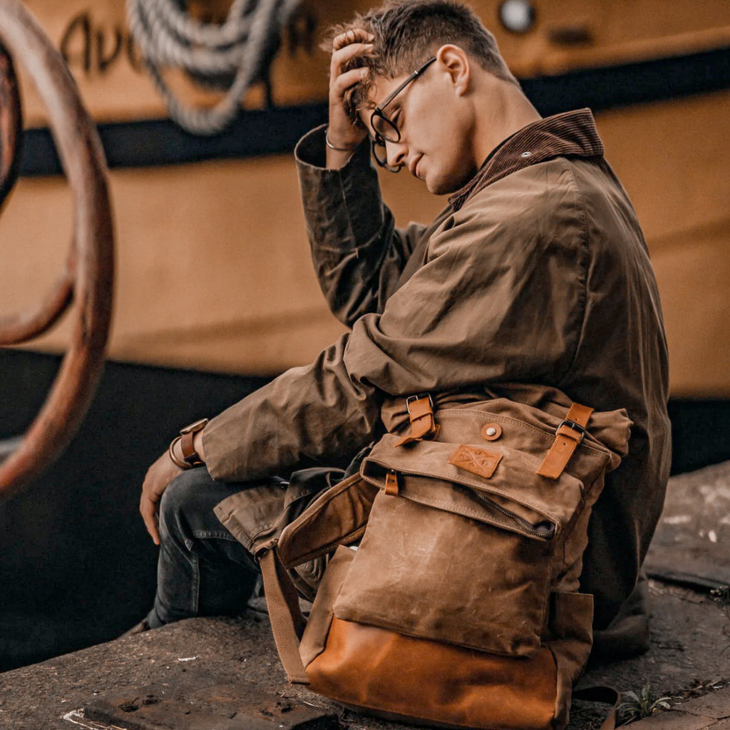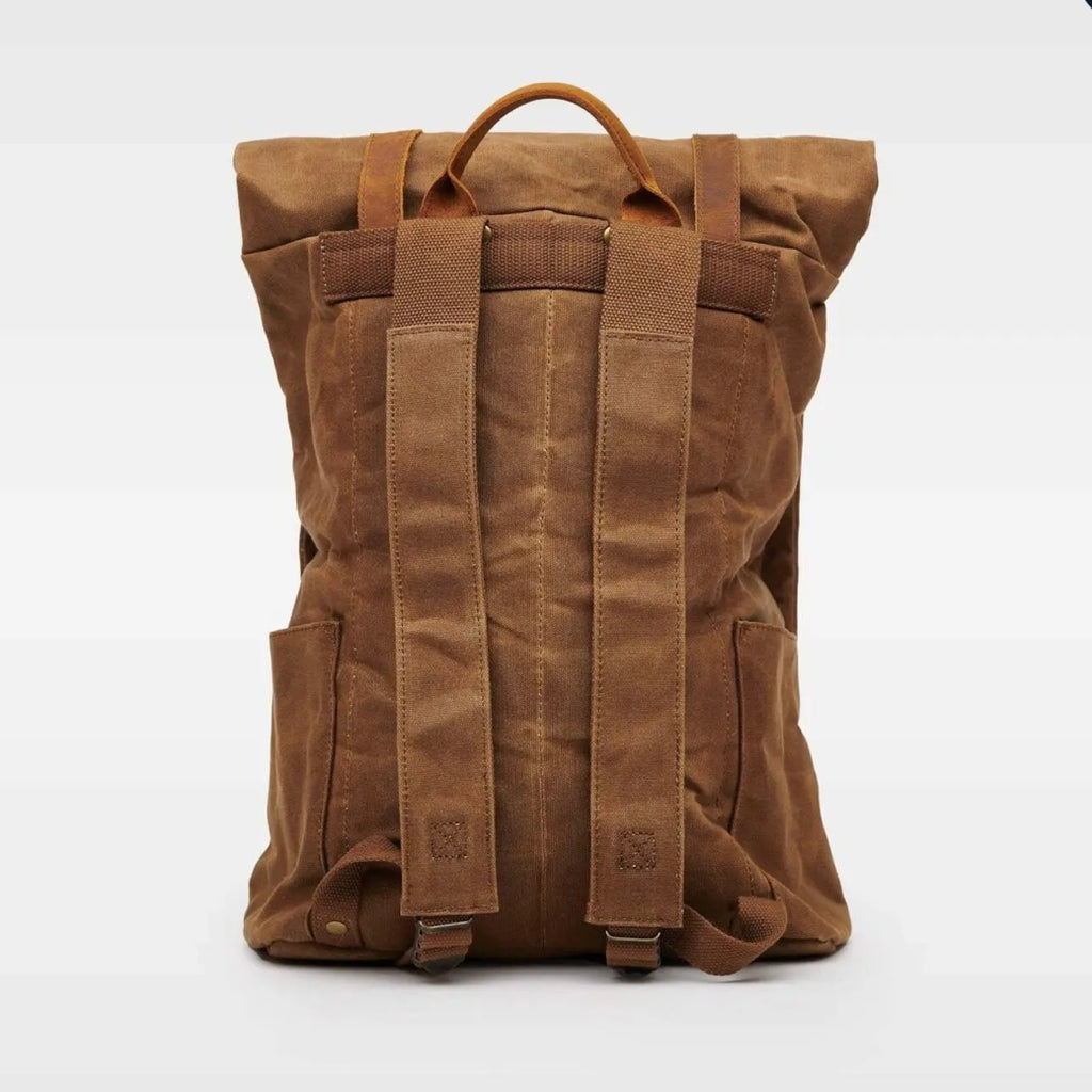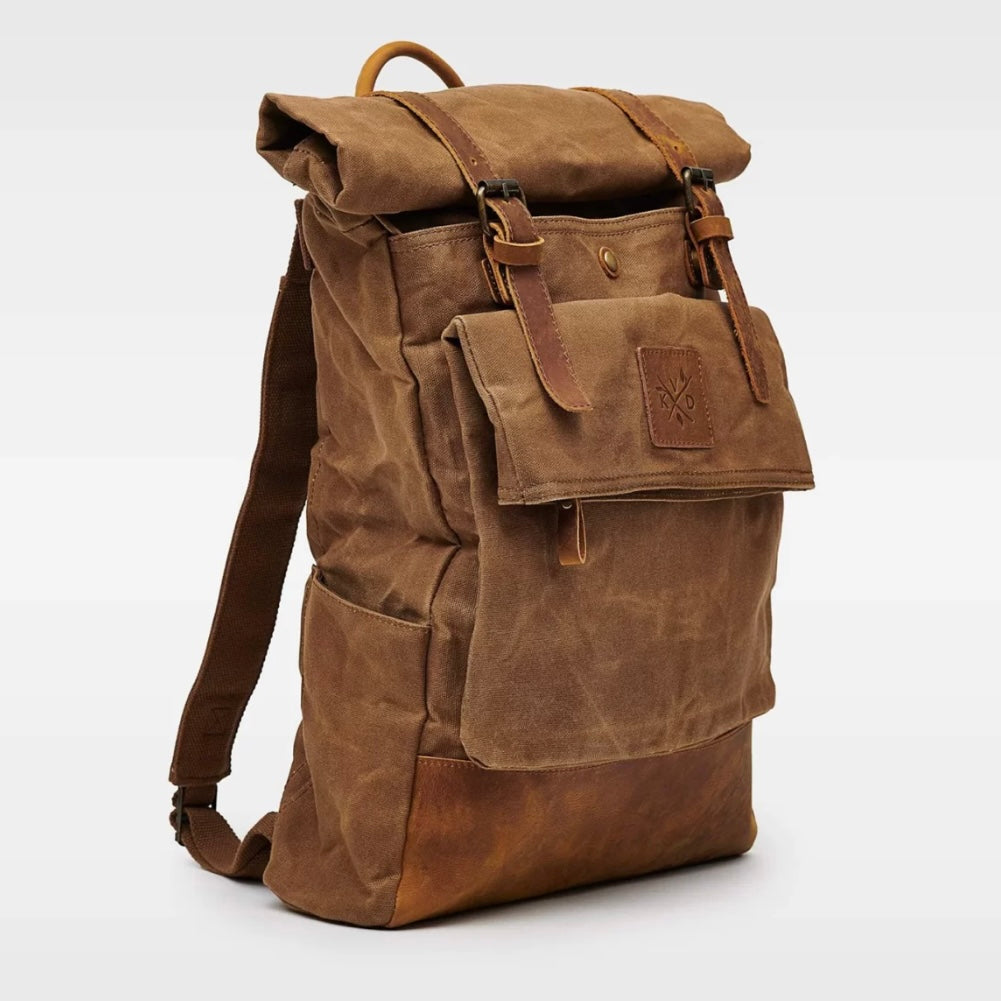 Inspired by timeless vintage aesthetics, this waxed canvas roll-top backpack combines practicality with style.