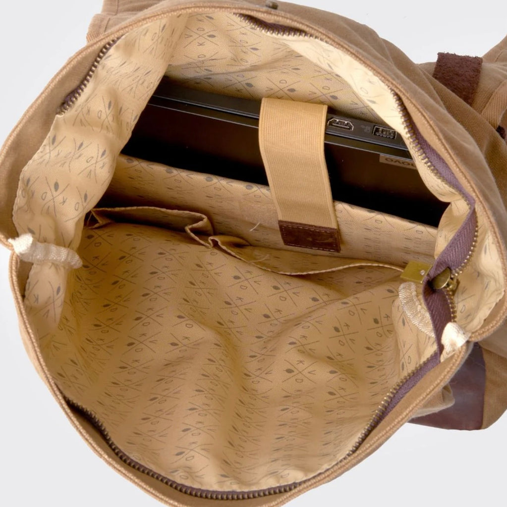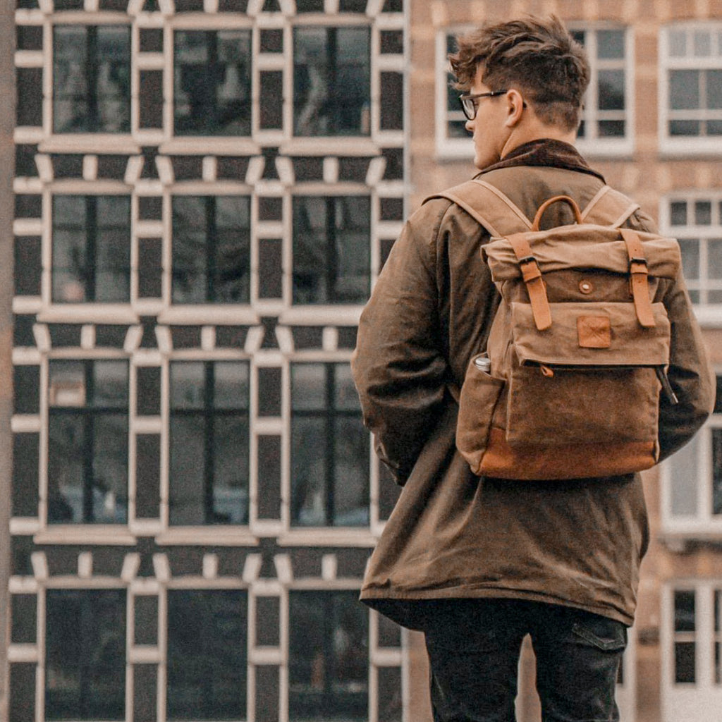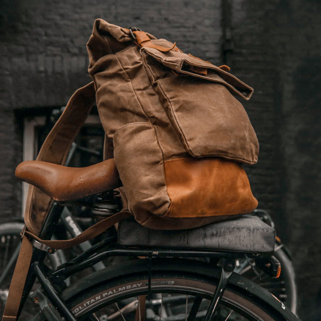 Inspired by timeless vintage aesthetics, this waxed canvas roll-top backpack combines practicality with style.