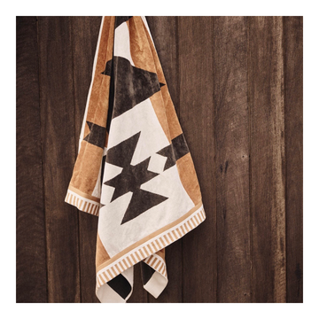 Rocky Mountain: Wrap yourself in the raw magic of alpine wilderness with the Rocky Mountain large towel bringing a touch of the American West to your daily rituals - on the sand, by the fire, or in your own slow-living sanctuary. Woven in a rich palette of earthy khaki, warm cream, and bold brown/spice, this towel captures the contrasts of the mountain range - from snow-dusted peaks to sunlit trails and ancient stone.