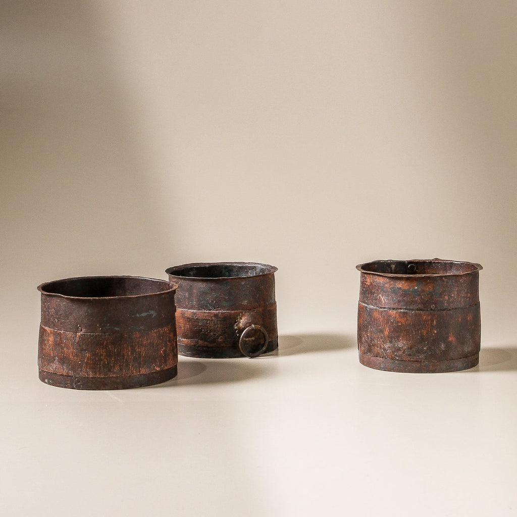 Infused with warmth and tradition, this vintage Indian iron bowl reflects the utilitarian beauty of everyday objects crafted 60–80 years ago in Rajasthan. Once used in village kitchens, its hand-forged surface and wax finish highlight the simple strength of iron, now reimagined as a decorative accent. Perfect for styling on shelves, coffee tables, or kitchen benches, it adds a touch of heritage charm to any space.